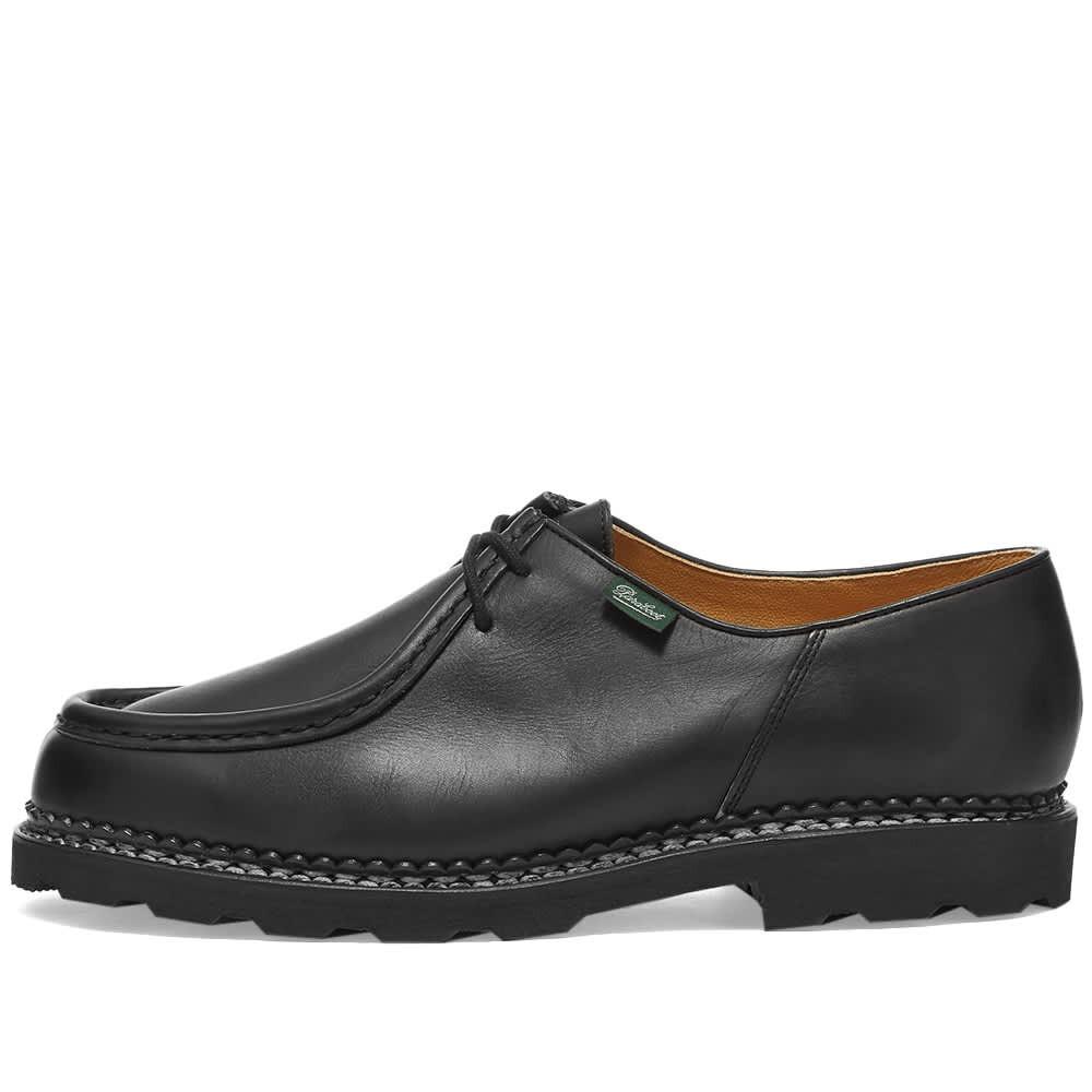 Дерби Michael с двумя люверсами дебютировало в 1945 году и, возможно, является самой знаковой моделью французского лейбла Paraboot. Эта черная версия традиционна по внешнему виду, с верхом из гладкой кожи, водонепроницаемым норвежским рантом и толстой резиновой подошвой. На воротнике есть даже зеленый лейбл с логотипом.