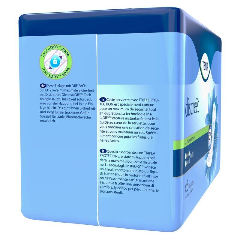 TENA Discreet Maxi — это прокладка при недержании, которая идеально подходит всем женщинам с тяжелыми и непроизвольными выделениями мочи. Технология InstaDRY обеспечивает удаление жидкости за считанные секунды, а супервпитывающий слой надежно удерживает внутри даже большее количество жидкости и обеспечивает максимальную защиту. Удобная прокладка при недержании имеет эластичную форму по бокам и мягко адаптируется к форме вашего тела. Благодаря тройной защите от протечек, влаги и запахов TENA Discreet Maxi является лучшим выбором для всех женщин с серьезной слабостью мочевого пузыря. Всегда чувствуйте себя надежно защищенным благодаря мгновенному впитыванию и удобной посадке.