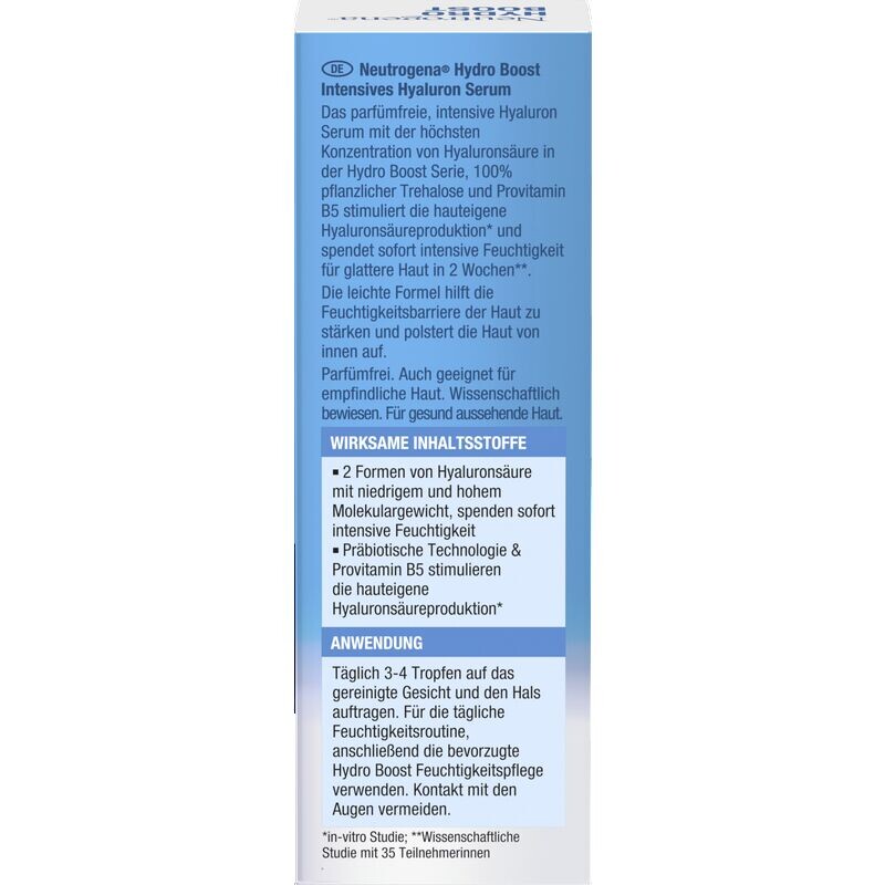 Интенсивная гиалуроновая сыворотка Neutrogena Hydro Boost без отдушек содержит 2 формы гиалуроновой кислоты, провитамин B5 и пребиотическую технологию. Кроме того, интенсивная сыворотка для лица стимулирует выработку собственной гиалуроновой кислоты*, обеспечивает интенсивное увлажнение и делает кожу более гладкой всего за 2 недели**. Гиалуроновая сыворотка содержит самую высокую концентрацию гиалуроновой кислоты в серии Hydro Boost, 100% трегалозу растительного происхождения и провитамин B5, которые мгновенно обеспечивают интенсивное увлажнение и разглаживание кожи изнутри.