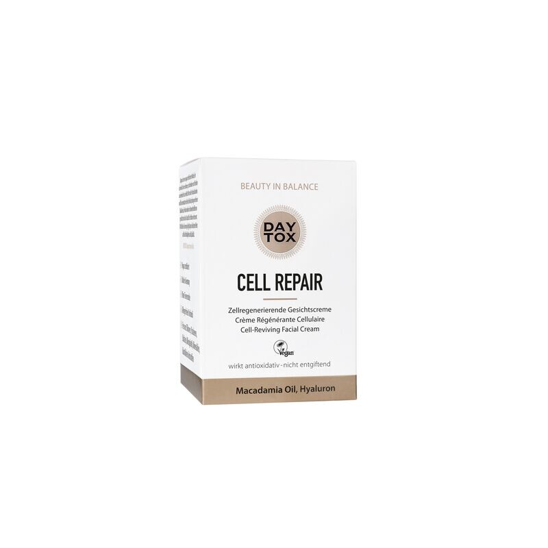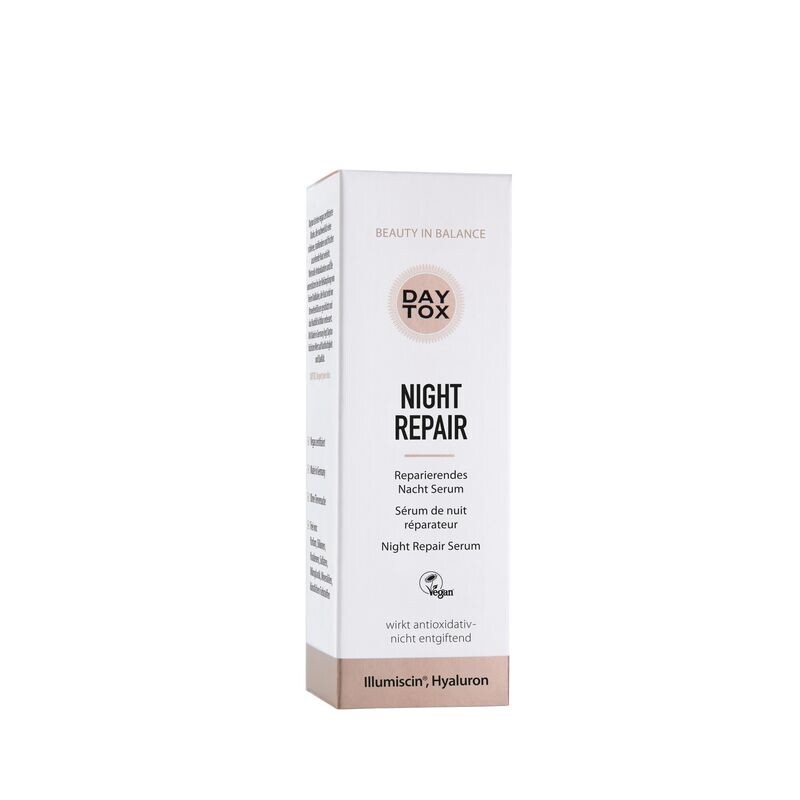 Для регенерированной и питаемой кожи в ночное время: ночная восстанавливающая сыворотка DAYTOX восстанавливает и питает сухую и уставшую кожу в ночное время. Благодаря комплексу активных ингредиентов, состоящему из витамина С, цинка и экстракта листьев оливы, на следующее утро кожа выглядит свежей и отдохнувшей. DAYTOX Cell Repair с гиалуроновой кислотой и ценным маслом макадамии придает коже шелковистость и мягкость.