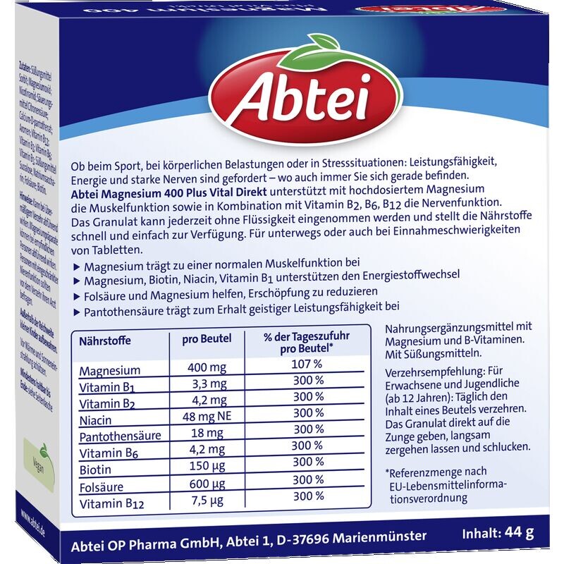 Во время занятий спортом, при физических нагрузках или в стрессовых ситуациях: необходимы работоспособность, энергия и крепкие нервы — где бы вы ни находились. Abtei Magnesium 400 Plus Vital Direkt поддерживает функцию мышц с помощью высоких доз магния и, в сочетании с витаминами B2, B6, B12, функцию нервов.