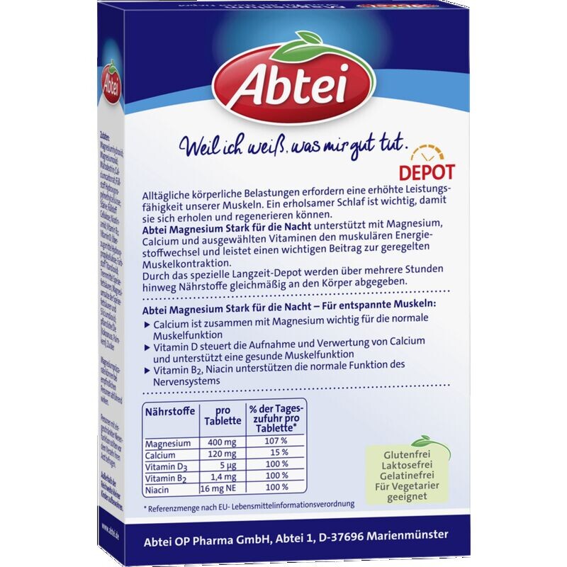 Повседневная физическая нагрузка требует повышенной производительности наших мышц. Спокойный сон важен для того, чтобы вы могли восстановиться и восстановить силы. Abtei Magnesium Strong на ночь поддерживает энергетический обмен в мышцах с помощью магния, кальция и некоторых витаминов и вносит важный вклад в регулируемое сокращение мышц. Благодаря специальному долговременному депо питательные вещества доставляются в организм равномерно в течение нескольких часов.