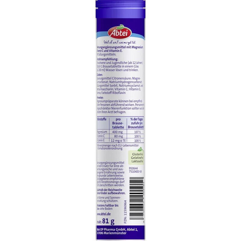 Достаточное количество магния важно для поддержания и активации мышечной функции. С нашими практичными шипучими таблетками магния вы сможете активно поддерживать свой организм во время занятий спортом и сильных стрессов. Шипучие таблетки Abtei Magnesium 400 Plus с освежающим вкусом лимона содержат высокие дозы магния, витамина С и витамина Е.