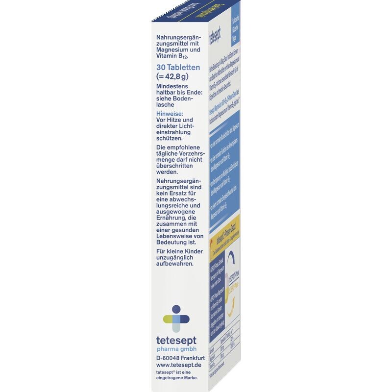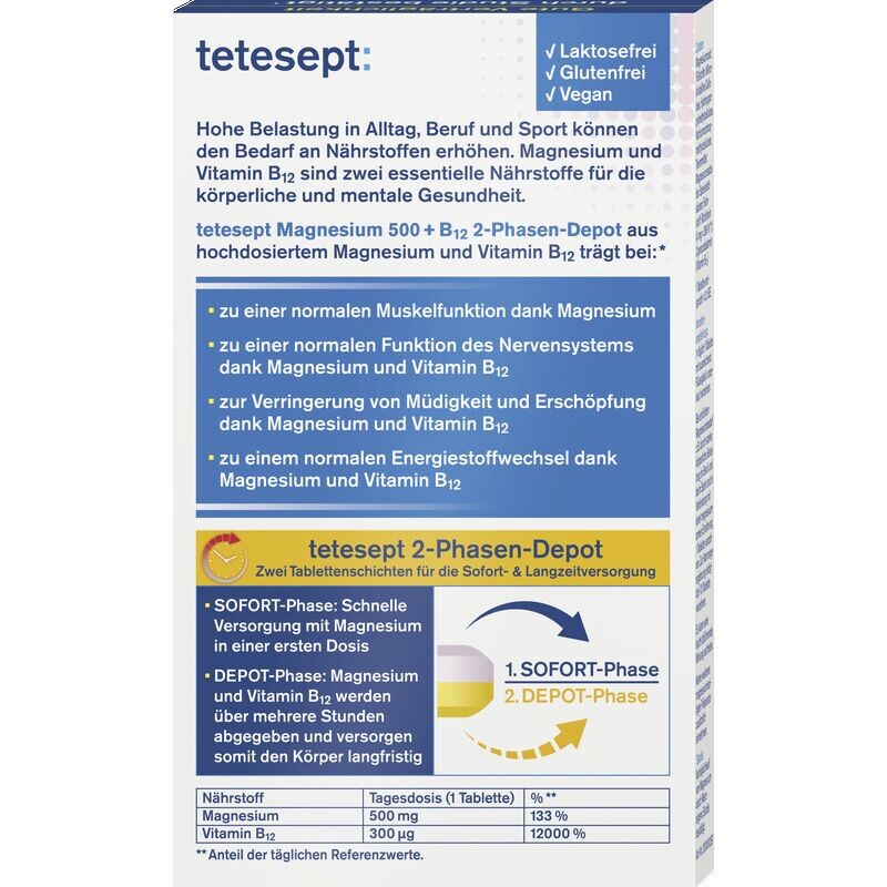 tetesept Magnesium 500+B12 2-фазное депо, изготовленное из высоких доз магния и витамина B12, способствует: