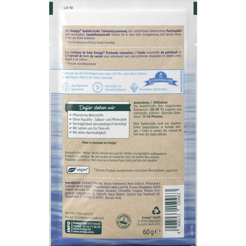 Кристаллы для ванны KNEIPP обеспечивают глубокую релаксацию с натуральным эфирным маслом пачули и ценным экстрактом сандала.