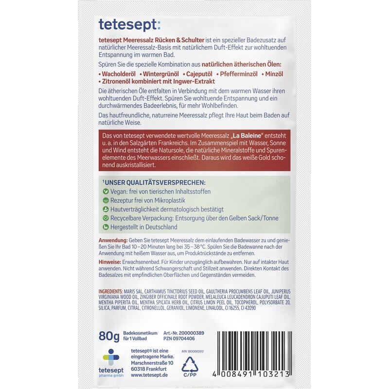 tetesept Sea Salt Back & Holder — это специальная добавка для ванн на основе натуральной морской соли с естественным ароматом, обеспечивающая успокаивающее расслабление в теплой ванне.