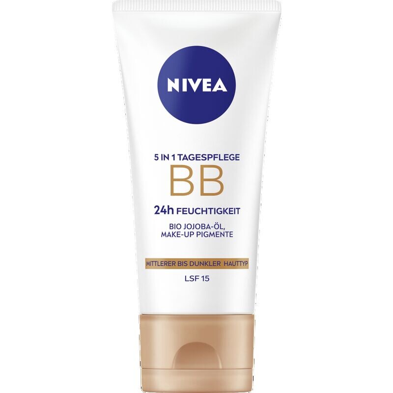 Дневной уход NIVEA BB 5 В 1 24 часа MOISTURE с органическим маслом жожоба и косметическими пигментами для среднего и темного типа кожи: выравнивает цвет лица и улучшает внешний вид. поры. Скрывает мелкие косметические недостатки, такие как признаки усталости, красноватые участки и мелкие морщинки. Совершенствует и придает естественно сияющий цвет лица. Обеспечивает кожу легкой, быстро впитывающейся влагой. Предотвращает преждевременное старение кожи, вызванное светом, благодаря SPF 15. Для естественного сияющего цвета лица! Совместимость с кожей подтверждена дерматологически.