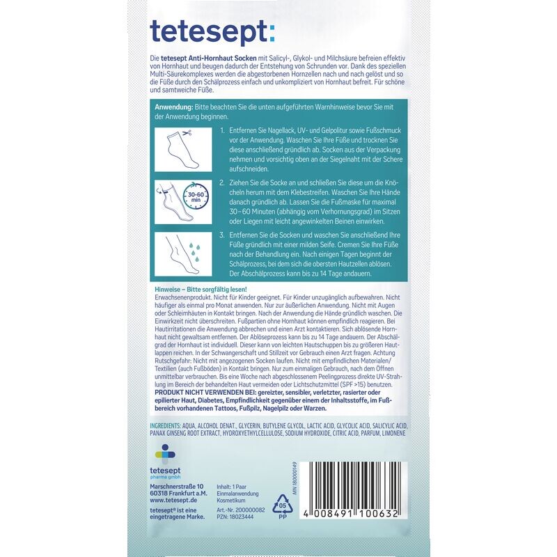 Носки против мозолей tetesept с салициловой, гликолевой и молочной кислотами эффективно удаляют мозоли и тем самым предотвращают образование трещин. Благодаря специальному мультикислотному комплексу отмершие ороговевшие клетки постепенно растворяются, а стопы легко и просто освобождаются от мозолей посредством процесса пилинга. Для красивых и бархатисто-мягких ног.