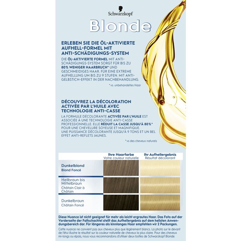 Формула активируемая маслом с системой защиты от повреждений обеспечивает до 80% меньше ломкости* волос и придает им эластичность. Волосы. Для максимального осветления до 9 уровней (в зависимости от оттенка). С эффектом против пожелтения в послеоперационном периоде.*по сравнению с. необработанные волосы