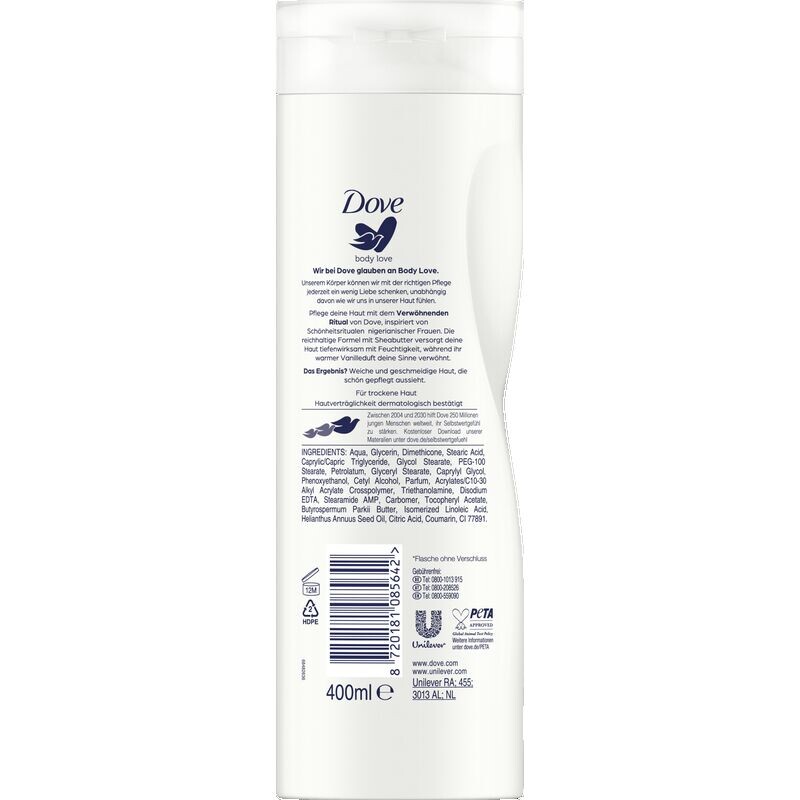 Побаловать свое тело и чувства приятно каждый день. Особенно если у вас сухая кожа, это настоящее облегчение — сознательно нанести крем и насладиться нежным ароматом ванили. наслаждаться. Именно поэтому компания Dove разработала ухаживающий лосьон для тела с маслом ши и ароматом ванили. Нежная формула содержит уникальный комплекс Dove care DUO, который сочетает в себе собственные ингредиенты для ухода за кожей и эффективные увлажняющие вещества, которые глубоко питают кожу и в то же время защищают ее от высыхания. Расслабиться «с ног до головы» – это так легко и невероятно приятно. Будет еще лучше, если вы превратите ежедневный уход за кожей в небольшой массажный ритуал с помощью этого тщательного лосьона для тела. Эффект немедленный: ощущение мягкой, гладкой кожи и красивое сияние.
