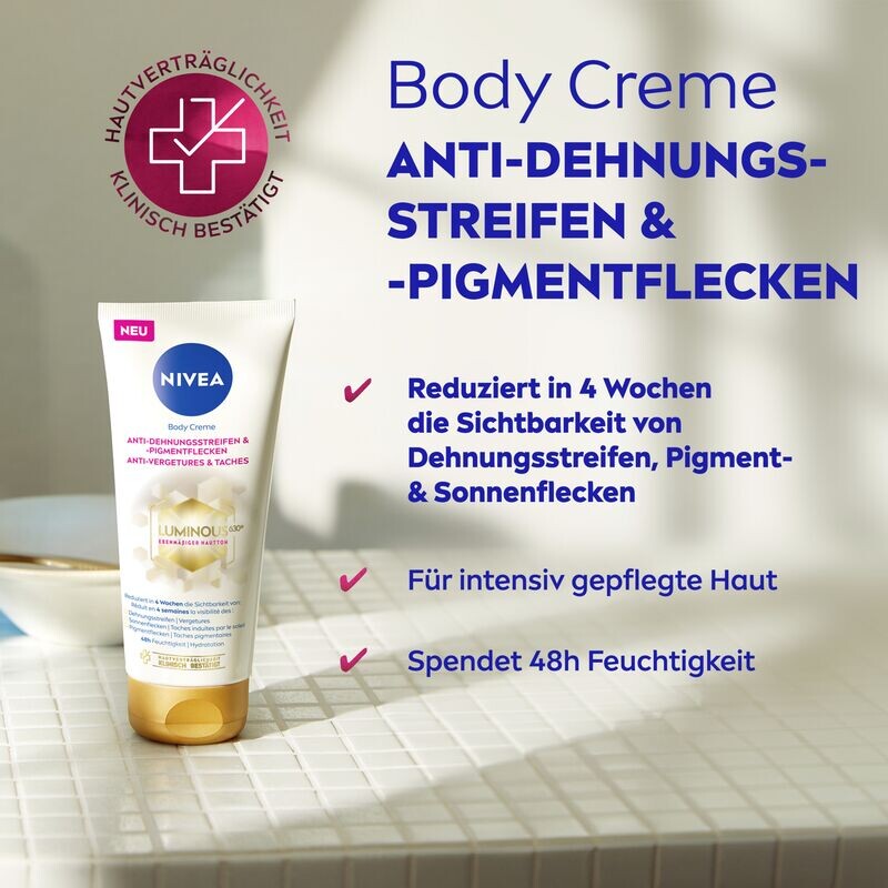 Питательная формула многофункционального крема для тела с запатентованным активным компонентом ингредиент LUMINOUS630 выравнивает различия в тоне кожи и тем самым уменьшает видимость растяжек, пигментации и солнечных пятен за 4 недели. Его легкая текстура быстро впитывается, обеспечивает увлажнение на 48 часов и обеспечивает интенсивный уход за кожей – эффект, который вы можете почувствовать и увидеть. Совместимость с кожей подтверждена клинически.