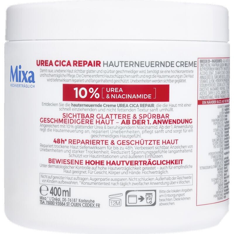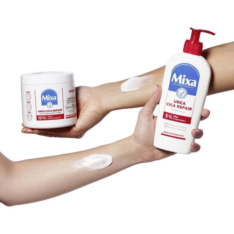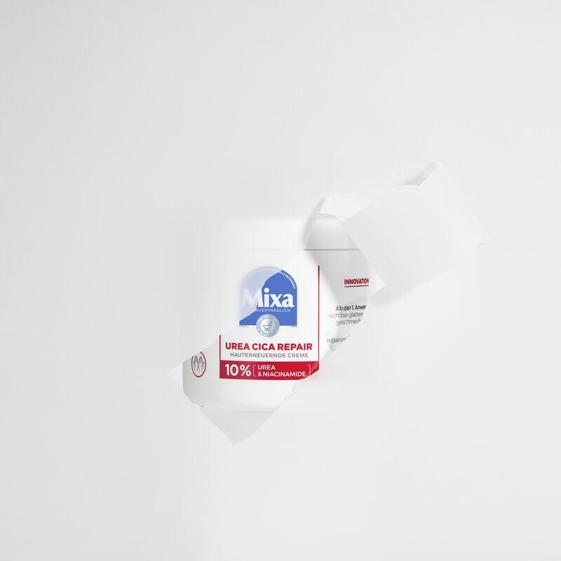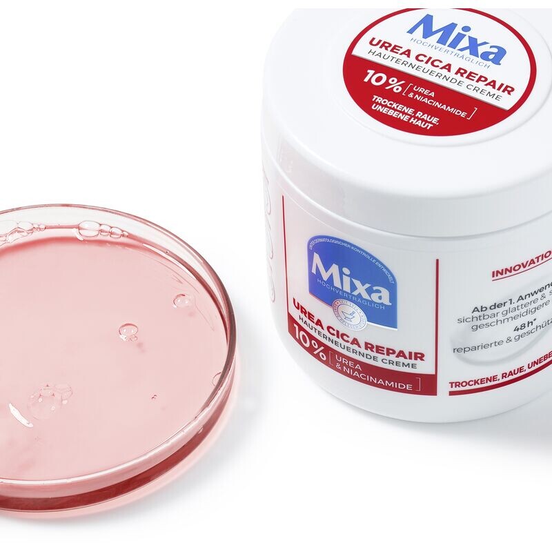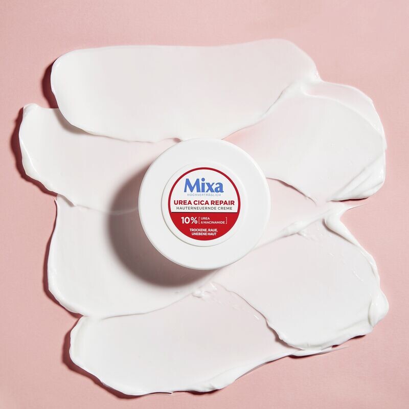Концентрированные активные ингредиенты в составе уход за кожей восстанавливает кожный барьер и защищает кожу от воздействия окружающей среды и сухости в течение 48 часов. Кроме того, аккуратно удаляются омертвевшие клетки кожи. Формула обновляющего крема для кожи Mixa Urea Cica Repair с ниацинамидами глубоко питает подверженную стрессу кожу и противодействует сильной сухости. На длительное время исчезают ощущения напряжения и раздражения кожи. Даже грубая, неровная кожа после нанесения крема снова становится мягкой и эластичной.