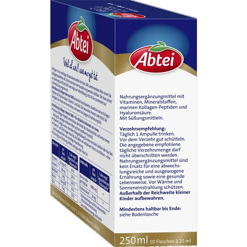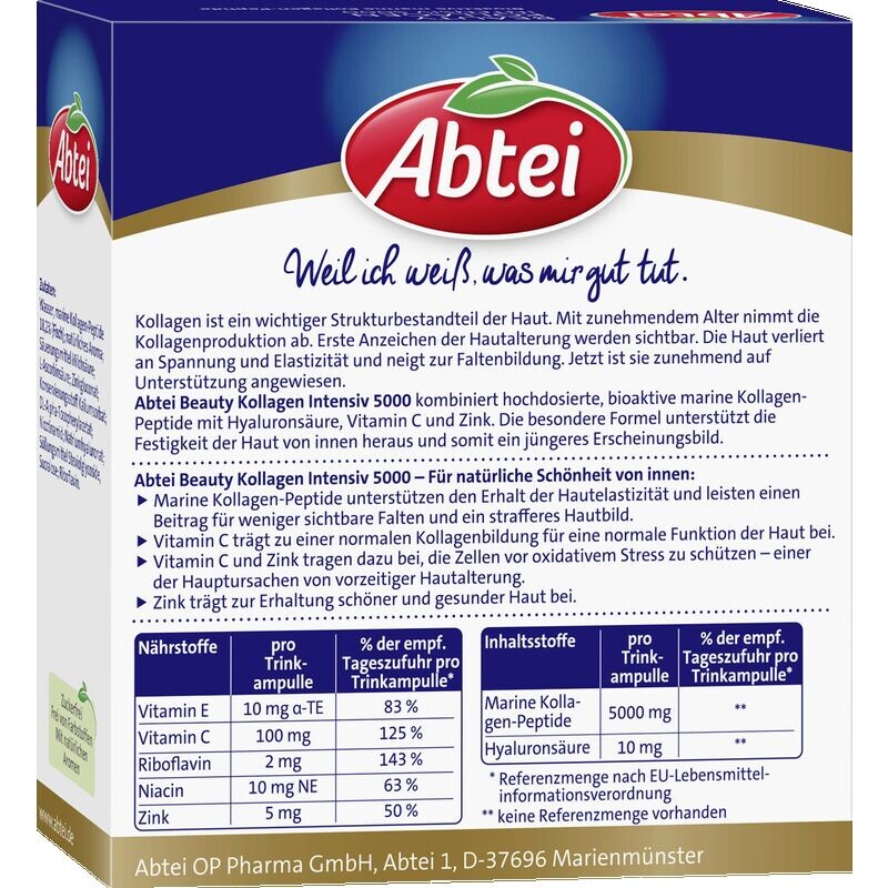С возрастом выработка собственного коллагена в коже снижается. Из-за этого кожа теряет тонус и эластичность. Результат – морщины. Чтобы эффективно противодействовать этому развитию, Abtei разработала жидкий рецепт красоты: Beauty Collagen Intensiv 5000. В отличие, например, от обычных антивозрастных кремов, новые питьевые ампулы эффективно действуют изнутри. Результат: меньше видимых морщин! Так что начните свой ежедневный уход за кожей прямо сейчас с Abtei Beauty Collagen Intensiv 5000.