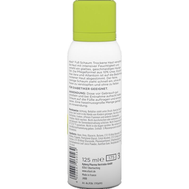 Пенка для ног efasit для сухой кожи интенсивно увлажняет кожу и придает ей ощущение гладкости и эластичности. Формула ухода, состоящая из 10% мочевины, глицерина, алоэ вера и аллантоина, идеально адаптирована к потребностям сухой кожи. Нежная кремовая пена быстро впитывается, не забивает поры и не оставляет жирного блеска.