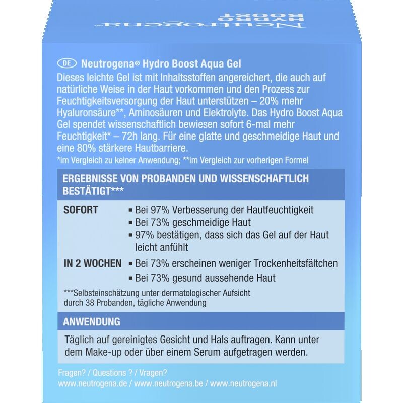 Научно доказано, что гель Neutrogena Hydro Boost Aqua мгновенно обеспечивает в 6 раз больше влаги* в течение 72 часов и укрепляет кожный барьер на 80%. Улучшенная формула обогащена ингредиентами, которые поддерживают процесс увлажнения кожи. Увлажняющий гель обеспечивает немедленное и научно подтвержденное (самооценка под дерматологическим наблюдением 38 испытуемых, ежедневное использование) улучшение влажности кожи на 97%, повышение эластичности кожи на 73% и 97% подтверждают, что гидрогель ощущается на коже легким.