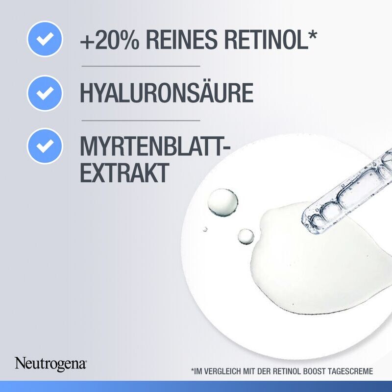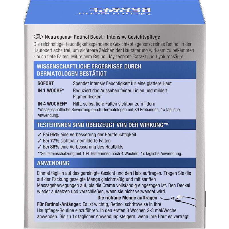 Интенсивный уход за лицом Neutrogena Retinol Boost+ мгновенно обеспечивает интенсивное увлажнение, уменьшает появление тонких линий через 1 неделю* и надежно уменьшает пигментные пятна. Кроме того, увлажняющий крем без отдушек высвобождает чистый ретинол на поверхность кожи, стимулирует обновление клеток и, таким образом, борется с видимыми признаками старения кожи. Антивозрастной крем для лица помогает заметно уменьшить даже глубокие морщины за 4 недели* и, как научно доказано, ускоряет выработку коллагена. (*Научная оценка дерматологов с участием 39 испытуемых, 1 раз в день)