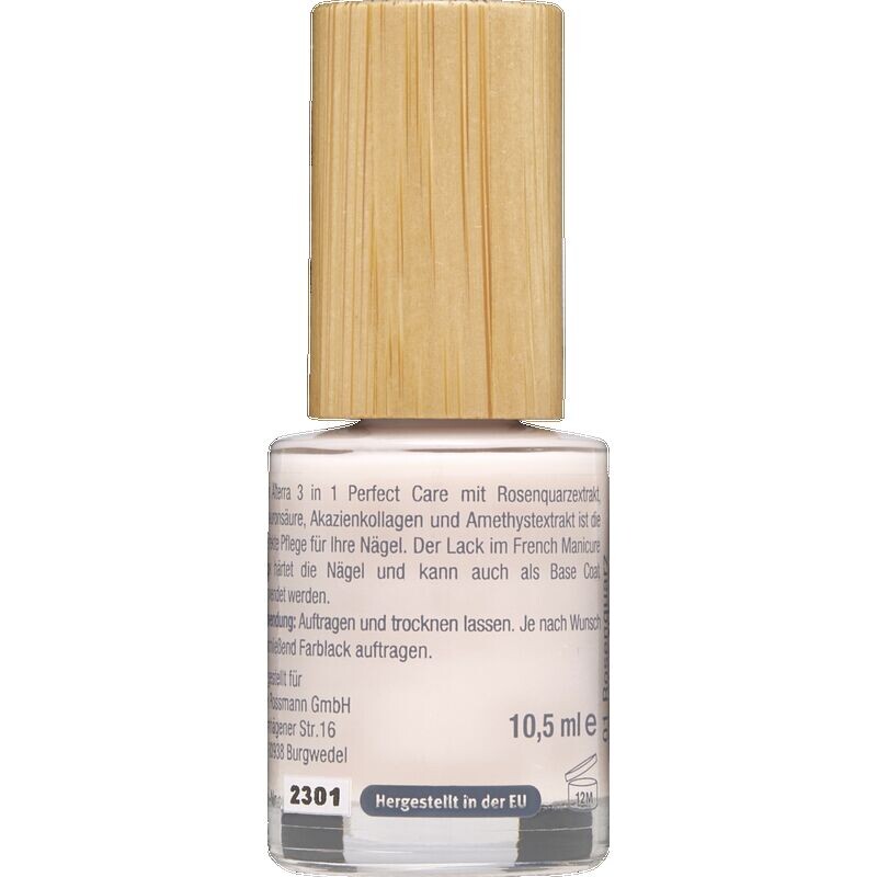 Alterra 3 в 1 Perfect Care с экстрактом розового кварца, гиалуроновой кислотой, коллагеном акации и экстрактом аметиста — идеальный уход за вашими ногтями. Лак для французского маникюра укрепляет ногти, а также может использоваться в качестве базового покрытия. Веганский