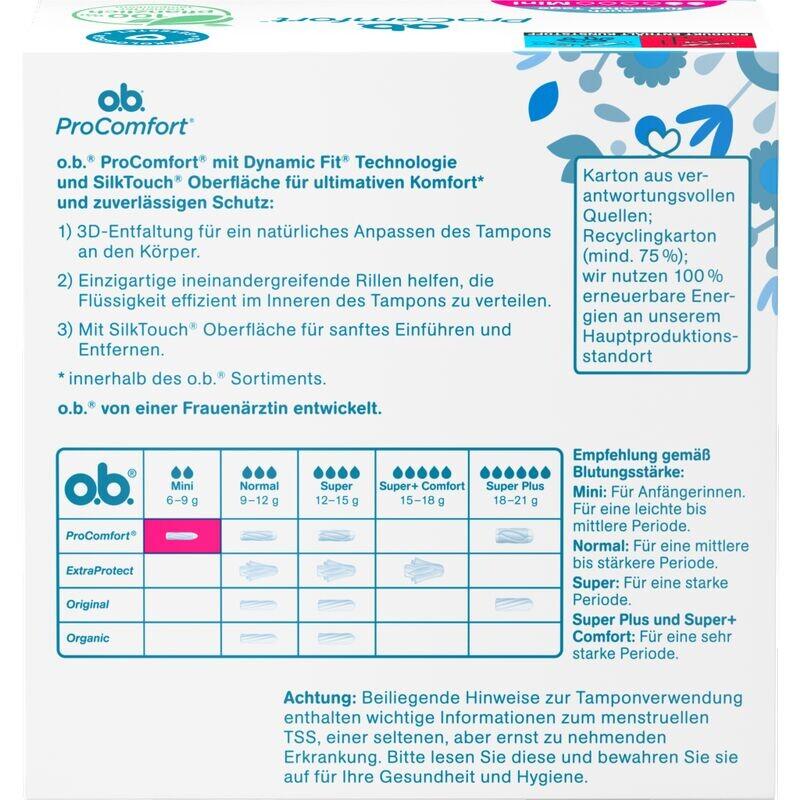 o.b. Тампоны ProComfort Normal с технологией Dynamic Fit и поверхностью SilkTouch для максимального комфорта* и надежной защиты. Технология Dynamic Fit с 3D-раскладыванием обеспечивает естественное прилегание тампона к телу, а уникальные взаимосвязанные канавки помогают эффективно распределять жидкость внутри тампона. С поверхностью SilkTouch для особенно легкой установки и удаления. если. Тампоны ProComfort Normal лучше всего подходят для средних и тяжелых дней. Поскольку тампоны упакованы в индивидуальную упаковку, их идеально брать с собой в дорогу. Практичный поворотный механизм позволяет легко и быстро открыть.
