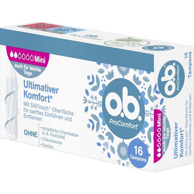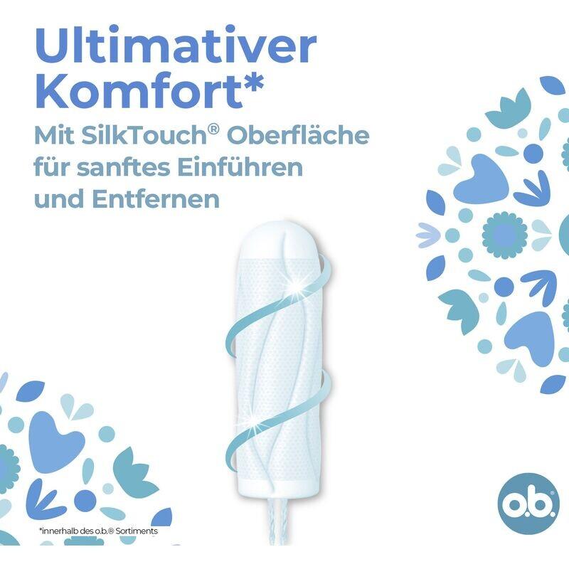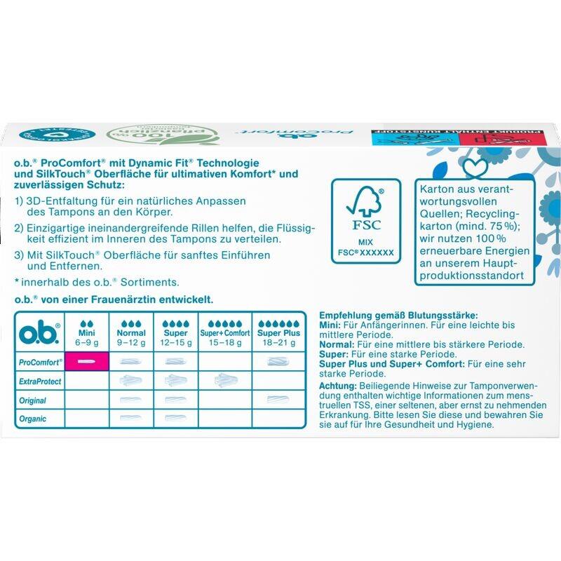 Тампоны o.b. ProComfort с технологией Dynamic Fit и поверхностью SilkTouch обеспечивают максимальный комфорт* (*в пределах ассортимента o.b.) и надежную защиту: трехмерное раскладывание обеспечивает естественное прилегание тампона к телу, а уникальные взаимосвязанные канавки помогают эффективно распределять жидкость внутри тампона. Поверхность SilkTouch обеспечивает особенно мягкую установку и извлечение. Кроме того, тампоны o.b. ProComfort прошли гинекологические испытания, содержат 100% растительную сердцевину тампона и не содержат вредных химикатов (например, пестицидов), хлорного отбеливателя и отдушек.