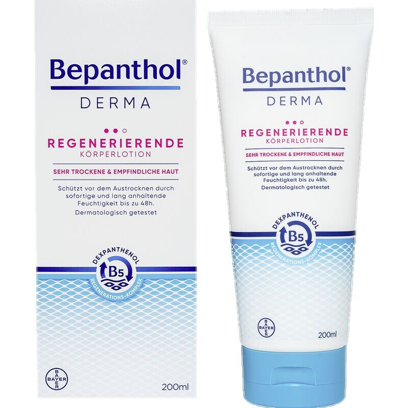 Bepanthol DERMA Regenerating Body Lotion — средство по уходу за телом для чувствительной и очень сухой кожи — дерматологически протестированный увлажняющий крем с декспантенолом, без ароматизаторов и консервантов. Специальный рецепт. Bepanthol DERMA устраняет основные причины сухости кожи. Регенерирующий комплекс B5 с декспантенолом (провитамин B5), ниацинамидом (витамин B3), натуральными липидами, такими как масло ши и аргановое масло, физиологическими липидами и глицерином, поддерживает регенерацию кожи - изнутри наружу.