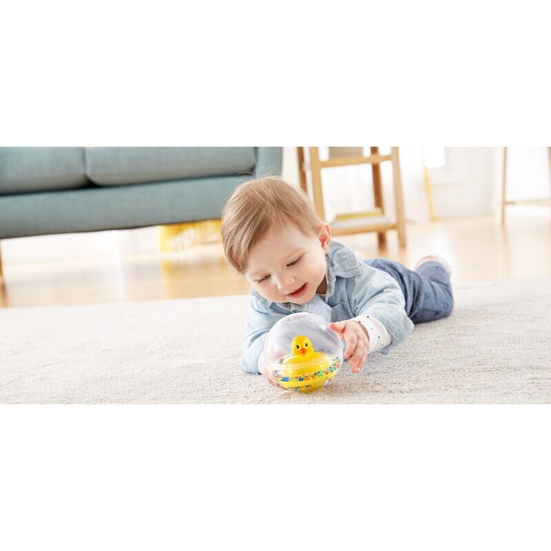 Счастливая желтая утка, которая плавает в большом прозрачном пластиковом шаре и предоставляет отличные возможности для игр как младенцам, так и малышам. Это побуждает маленьких детей тыкать и кататься. Дети постарше будут с энтузиазмом ползать за мячом. Мяч идеально лежит в детских ручках. Внутри кружится конфетти, приглашая вас встряхнуть его. Мелкая моторика ребенка развивается при подталкивании, захвате, отпускании и встряхивании мяча. А его крупная моторика тренируется, ползая за ним.