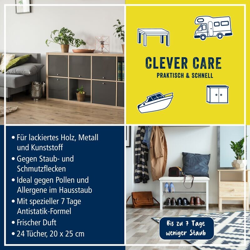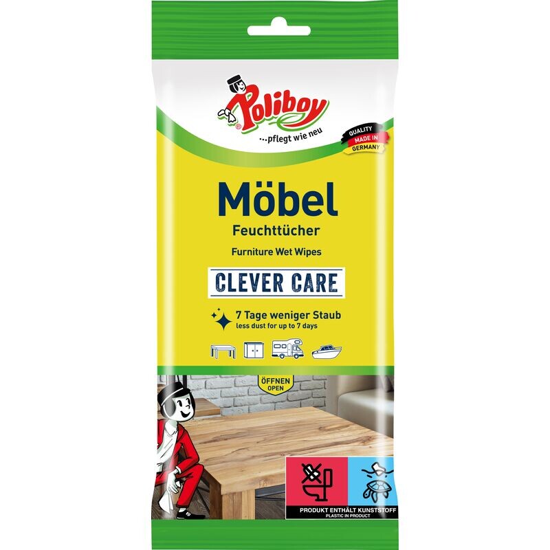 Влажные салфетки для мебели POLIBOY можно использовать по-разному: дома, в офисе или на даче. Этими пропитанными тряпками оптимально очищаются поверхности из дерева, а также пластика, стекла и металла. Грязь удаляется салфеткой – без повторной полировки, поверхности чистые без разводов. Пыль не поднимается вверх, а удерживается в ткани. Отложение пыли на обработанных поверхностях снижается на срок до 7 дней. Качественные парфюмерные масла при использовании создают приятный свежий аромат. Тщательно протирайте пыль с помощью влажных салфеток Clever Care от POLIBOY