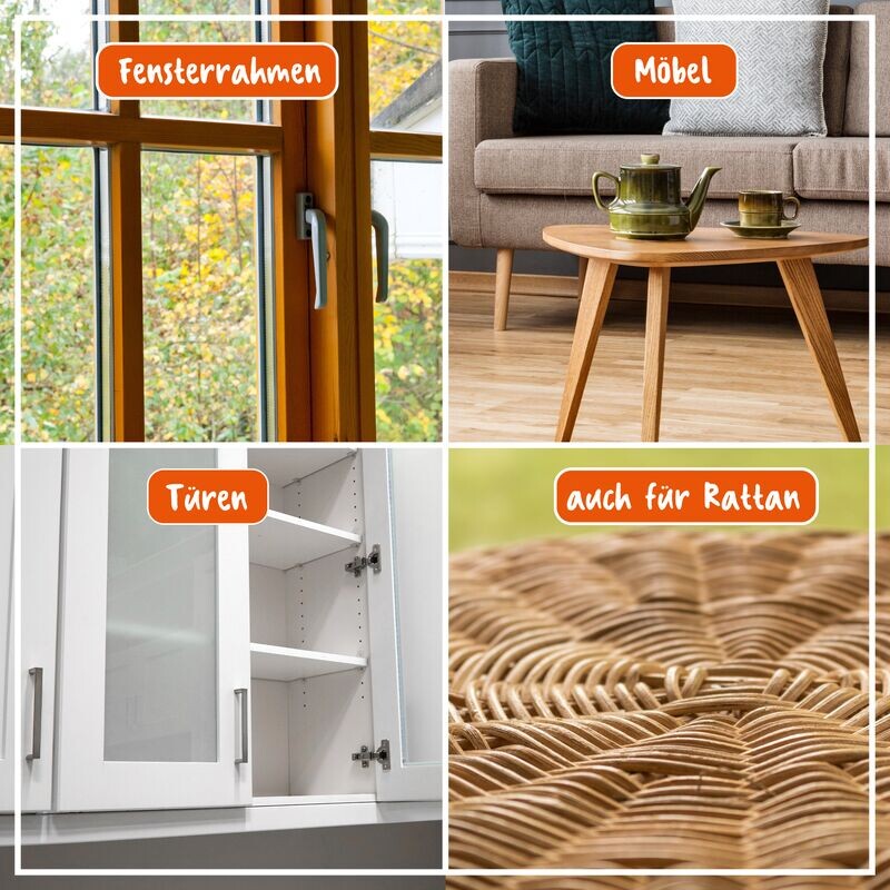Для всех окрашенных пород дерева. Также для оконных рам, панелей и ротанга.