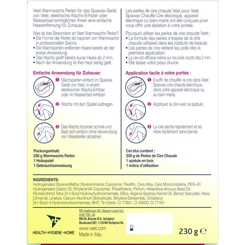 Теплые восковые шарики Veet с пчелиным воском подходят для использования в устройствах Spawax от Veet, электрических воскогревателях или на водяной бане и позволяют легко удалять волосы в домашних условиях. Маленькие шарики теплого воска особенно легко дозировать. В зависимости от части тела, подлежащей депиляции, необходимое количество можно нагреть.