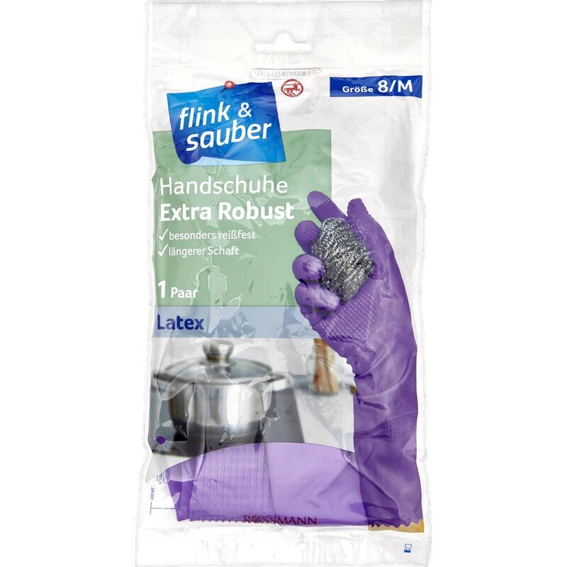 Удобные и чистые перчатки Extra Robust обеспечивают особенно надежный захват и не скользят при работе благодаря прочному латексному слою и специальному профилю с выступами. Удлиненный вал предотвращает попадание жидкости при мытье посуды. Внутренний флок из хлопка обеспечивает высокий уровень комфорта.