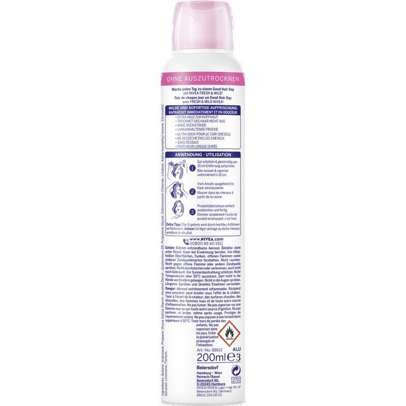 Никогда больше у вас не будет плохих волос! Сухой шампунь NIVEA Fresh & Mild — идеальное решение: он обеспечивает длительное ощущение свежести и приятный аромат сразу после использования, не пересушивая волосы. Сухой шампунь специально разработан для волос среднего тона и не оставляет на волосах белого налета.