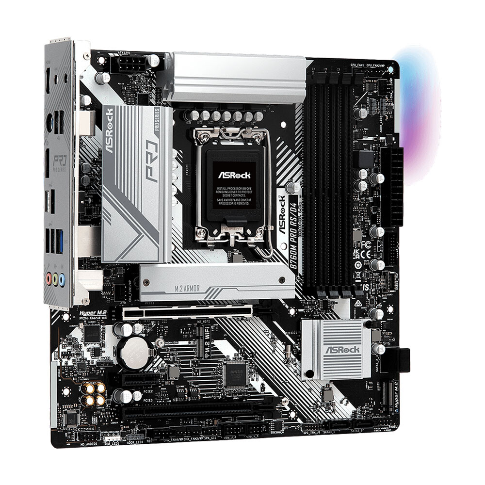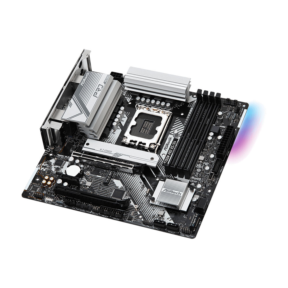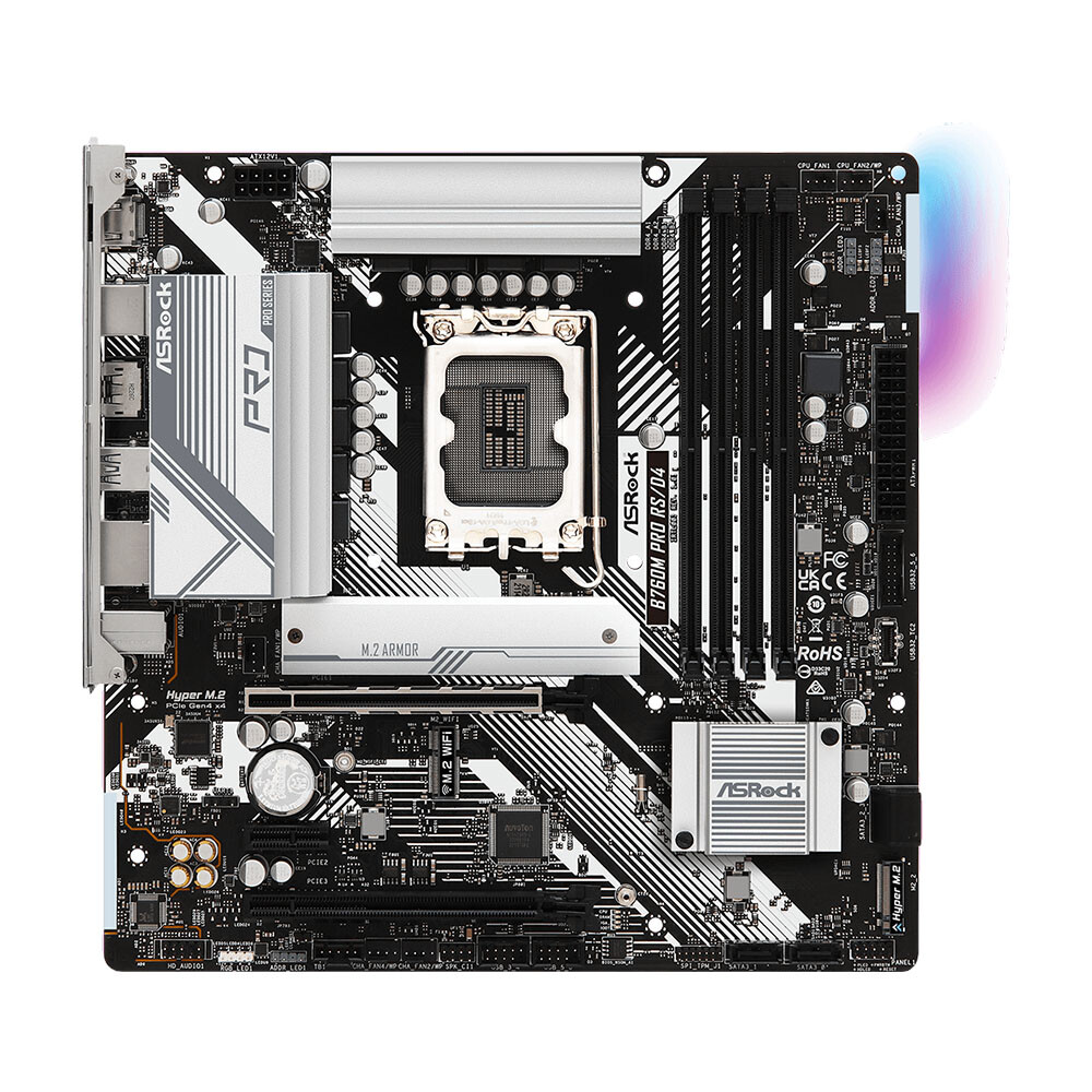 Материнская плата ASRock B760M Pro RS/D4 предлагает высокую производительность и широкие возможности для воплощения игрового потенциала. Комплектующая типоразмера Micro-ATX ориентирована на геймерские ПК и подходит для установки в ограниченном пространстве. Под оперативную память предусмотрены 4 слота DIMM DDR4. Подключение видеокарты возможно с помощью 2 слотов расширения PCI-E x16. Для устройств хранения предлагаются 2 разъема M.2 и 4 слота SATA.
