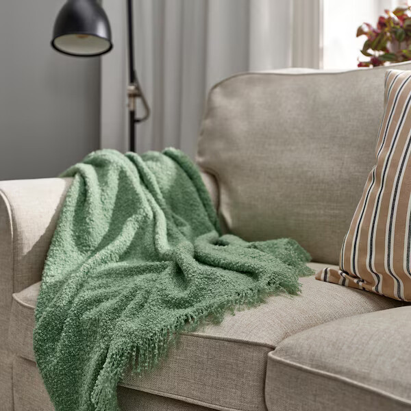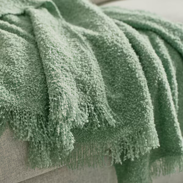 Супермягкий плед мятой вязки с бахромой — уютнее этого не придумаешь. Светло-зеленый оттенок легко комбинировать, а ткань изготовлена из 100% переработанного полиэстера.