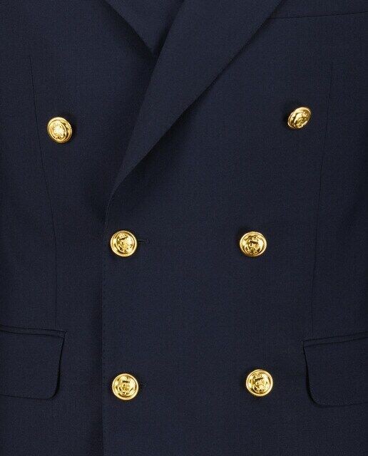 Двубортный пиджак с золотыми пуговицами, шестью пуговицами, двумя шлицами, прямыми карманами-кошельками, открытым молоточком, на подкладке.
