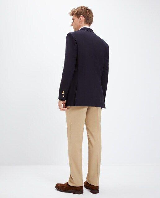 Пиджак с золотыми пуговицами, двумя пуговицами, двумя шлицами, косыми карманами-бумажниками с кармашком для билетов, открытым молоточком, на подкладке.