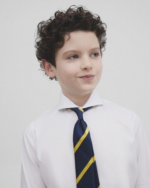 Детская классическая рубашка из белой хлопчатобумажной ткани, с вырезным воротником и простыми манжетами. В комплект входят наши вышитые ракетки на планке и специальные пуговицы Silbon. Сделано в Испании.