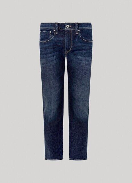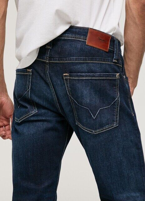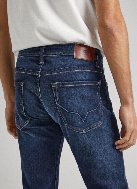 Эластичная и гибкая джинсовая ткань стандартной посадки, стандартной посадки и прямых штанин. Модель с пятью карманами с эффектом потертости, полосатые эластичные темно-синие детали, строчка на задних карманах и этикетка с логотипом PEPEJEANS на пятом кармане. Изготовлено как минимум из 70 % экологически чистого хлопка.