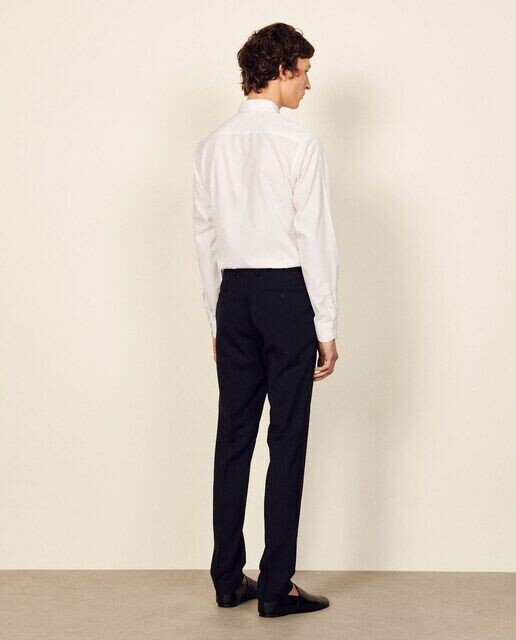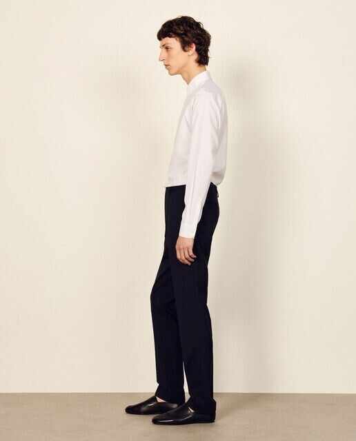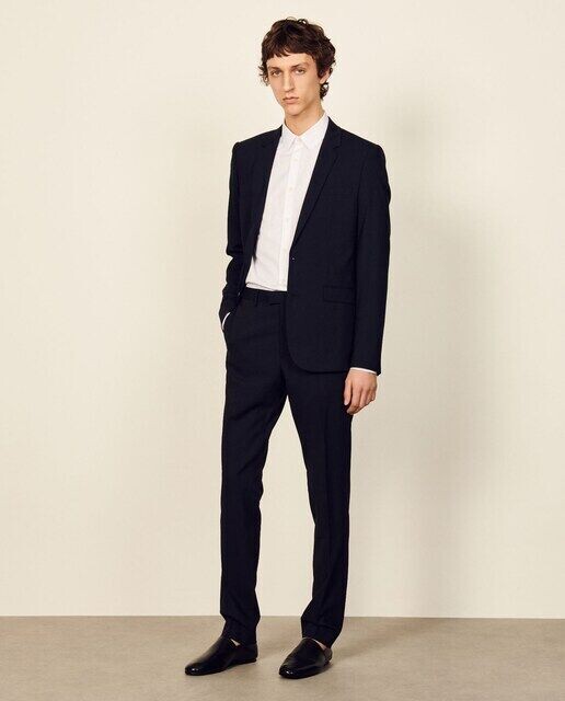 Мужские брюки Sandro. Шерстяные костюмные брюки. Подходит стройно. Застежка-молния, застежка на крючки и потайная пуговица под планкой. Два диагональных кармана по бокам. Прорезные карманы на пуговицах сзади. Шлевки. Пиджак в тон шерстяным костюмным брюкам. Рост модели 185 см, размер 38. В некоторых случаях могут потребоваться некоторые изменения, чтобы костюм идеально сидел по силуэту. В этом случае имейте в виду, что вы можете получить его и даже зарезервировать в бутике, чтобы наши специалисты по продажам могли помочь вам и проконсультировать вас по возможным вопросам. Sandro стремится к более ответственному подходу в рамках нашей системы отслеживания. В сотрудничестве с Fairly Made мы с полной прозрачностью сообщаем о происхождении и производстве нашей одежды. Все этапы подготовки и производства этих брюк проводились в Китае. Использовалась шерсть с австралийских ферм.