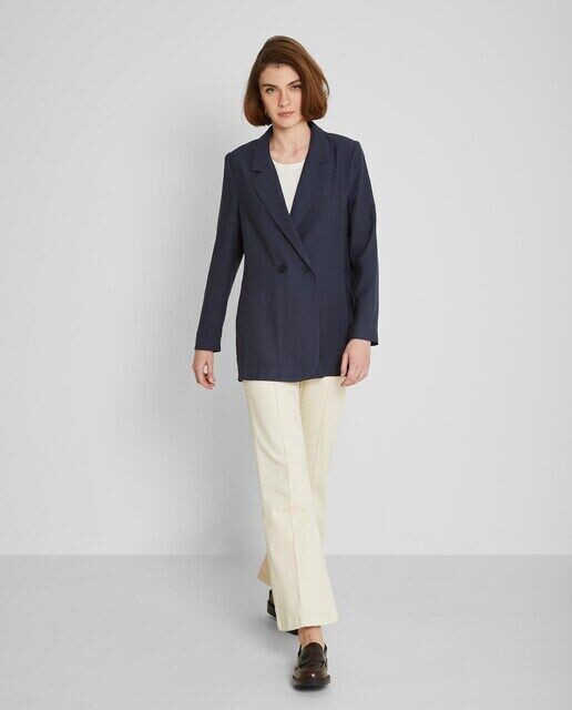 Двубортный пиджак, застегивающийся на пуговицы и воротник с лацканами.