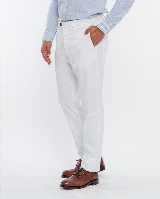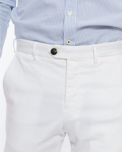 Белый чинос с четырьмя карманами, без складок. Застегивается на асимметричную пуговицу и молнию. Стильная, немного узкая, но удобная коробка и ширина ножек.