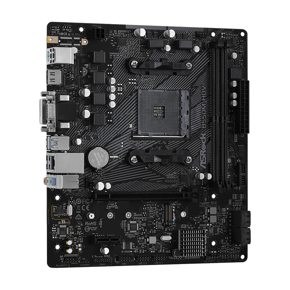 Материнская плата ASRock B550M-HDV в сочетании с компактными размерами и лаконичным оформлением обеспечивает высокие показатели производительности. Она выполнена в форм-факторе Micro-ATX. Основанная на чипсете AMD B550, плата предлагает 2 слота под оперативную память объемом до 64 ГБ, по одному слоту PCI-E x16 и PCI-E x1 под графический адаптер, 4 разъема SATA 6Gb/s и разъем M.2 для накопителей.