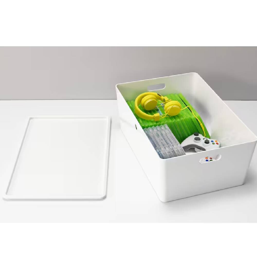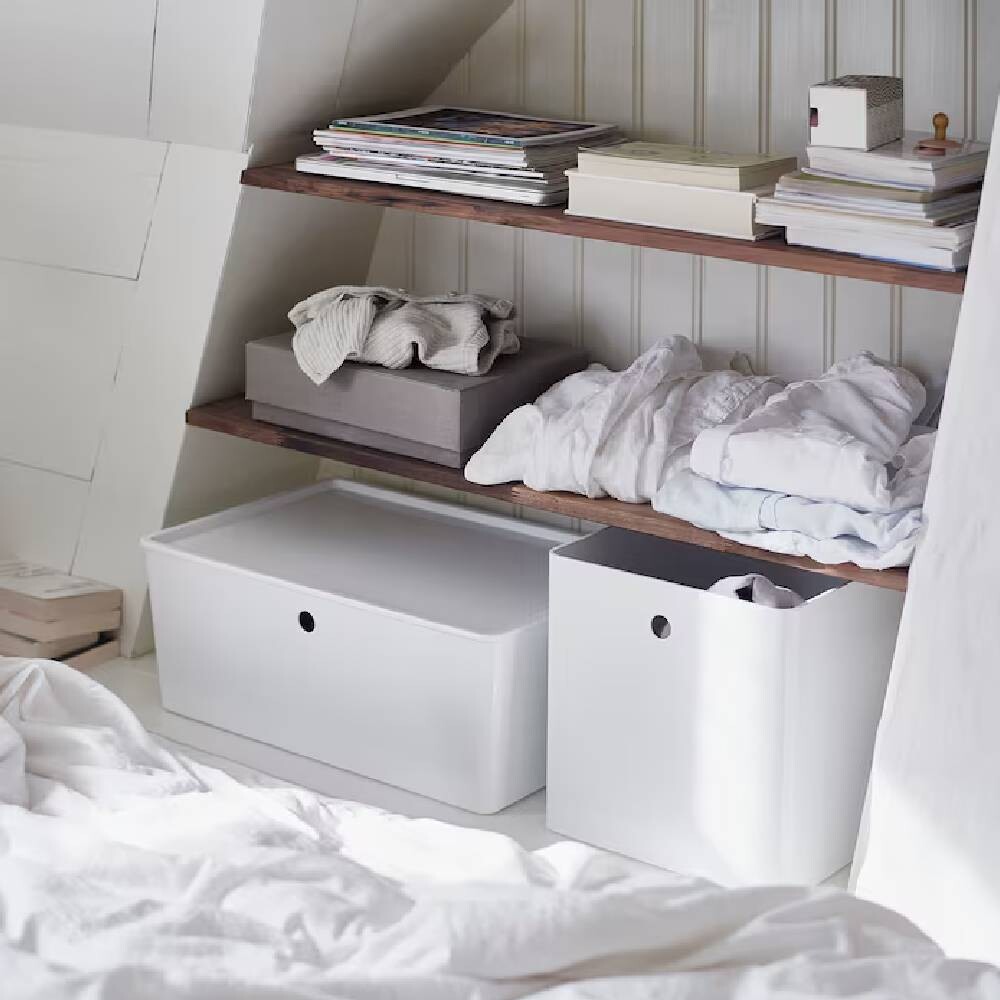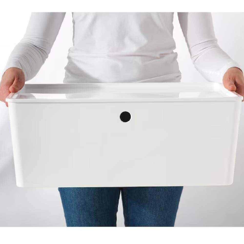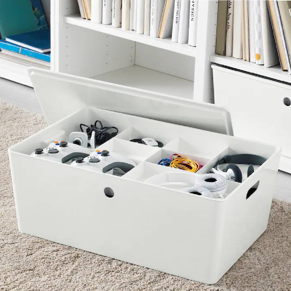 В этой большой коробке достаточно места, например, для игровых консолей и принадлежностей для хобби. Если вы хотите хранить в одном ящике и мелкие предметы, вы можете добавить ящик КУГГИС, который легко помещается внутри ящика.