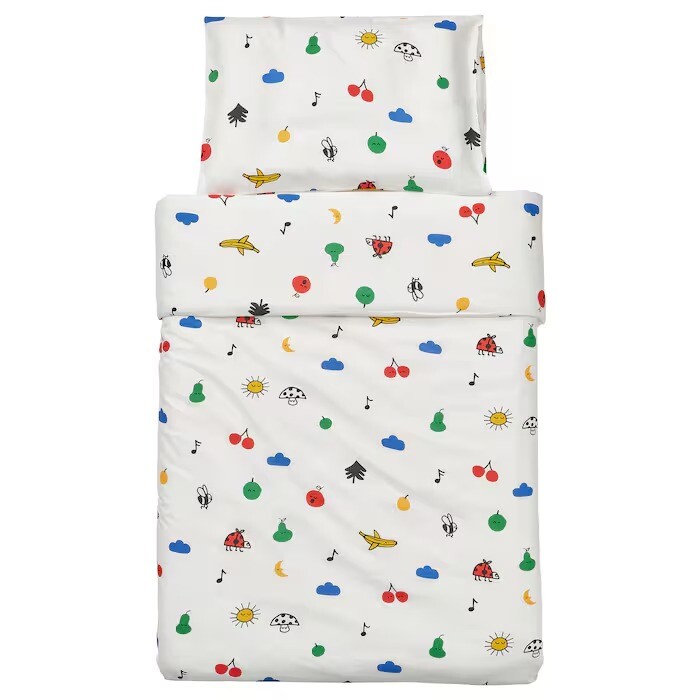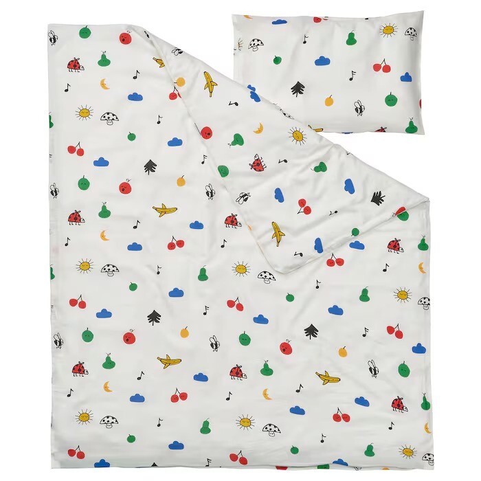 Этот комплект постельного белья состоит из пододеяльника и 1 наволочки. Когда придет время отдыхать малышу, его комфорт дополнит этот мягкий пододеяльник с разноцветными фруктами и фантастическими животными.
