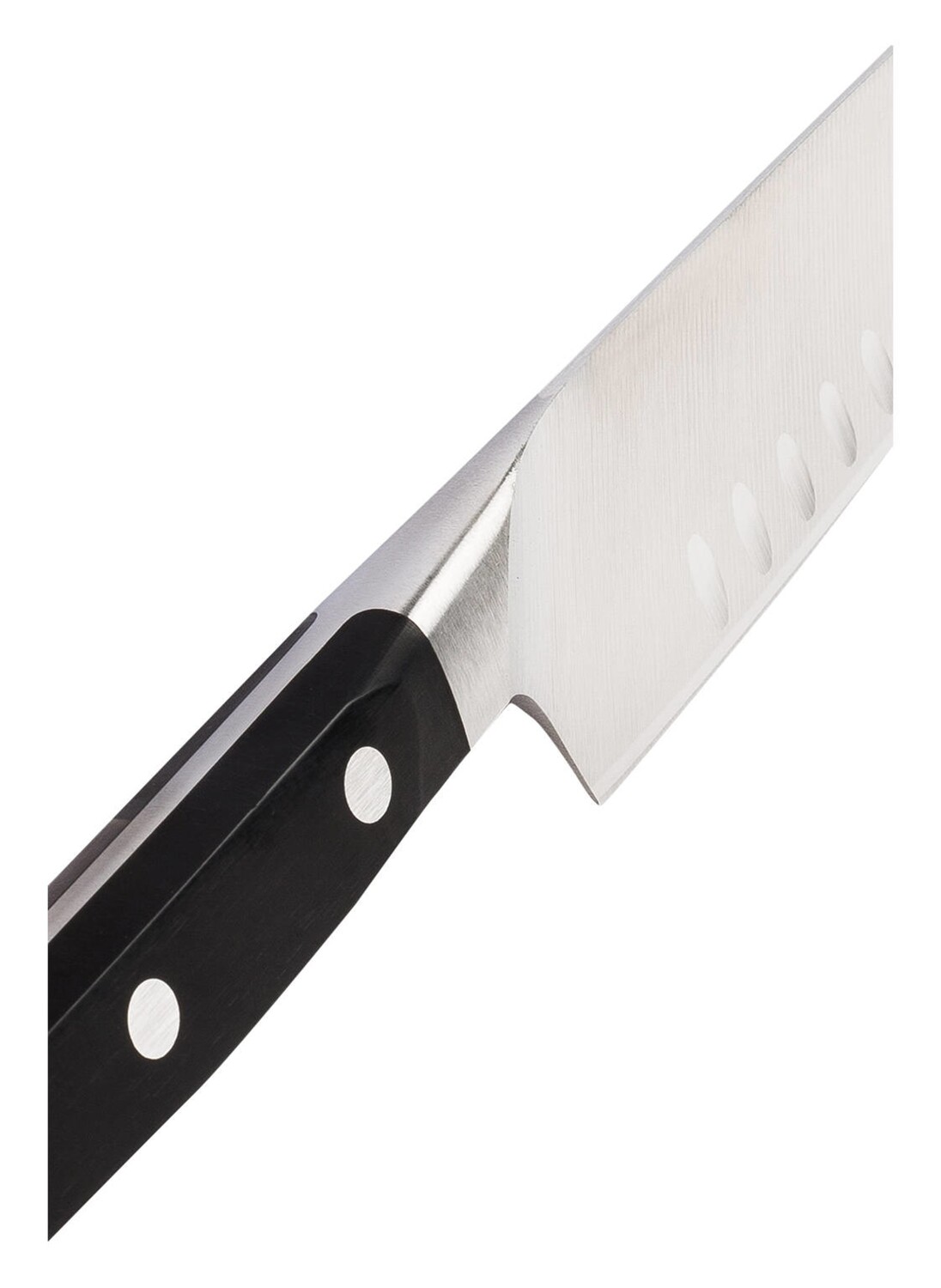 Этот нож Сантоку из серии ZWILLING Gourmet — воплощение японских традиций в немецком исполнении. Его главная особенность — рифленая заточка (желобки) на лезвии. При нарезке между сталью и продуктом образуются воздушные карманы, благодаря чему ломтики мяса, рыбы или овощей не прилипают к ножу. Это делает инструмент идеальным для тончайшей нарезки и быстрой работы на кухне.