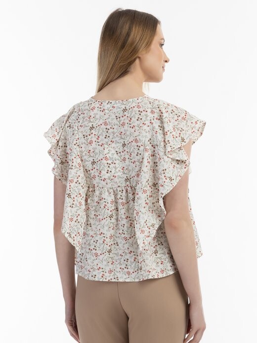 Блузка из уши выглядит женственно. Нежный цветочный принт, привлекательный V-образный вырез и изящные, обтянутые тканью пуговицы придают блузке романтичный вид, как и развевающиеся воланы, которые также служат короткими рукавами. Оборчатый шов на спине образует игривую баску.