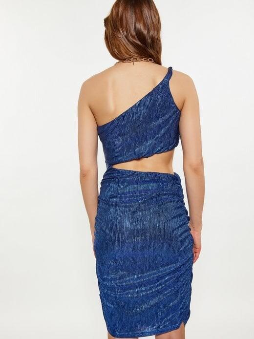Это платье с мерцающим эффектом и вырезом в верхней части тела излучает элегантность и современный стиль. Облегающий фигуру силуэт с оборками по бокам подчеркивает контуры тела и создает привлекательный образ. Это платье средней длины идеально подходит для официальных мероприятий или вечернего наряда.