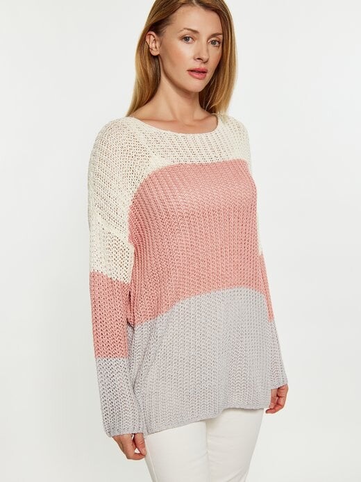 Представляем новинку в вашем гардеробе. Вязаный свитер со стильным узором в горизонтальную полоску. Полосы разной ширины придают этому свитеру свободного кроя интересный вид. Благодаря широкому закругленному вырезу и слегка завышенным плечам оно излучает комфорт и непринужденную элегантность. Длинные рукава и прямой подол делают его идеальным для многослойной одежды.