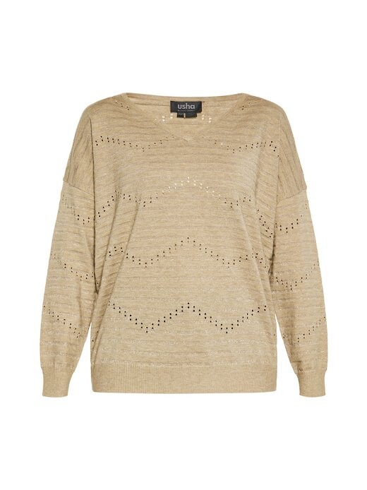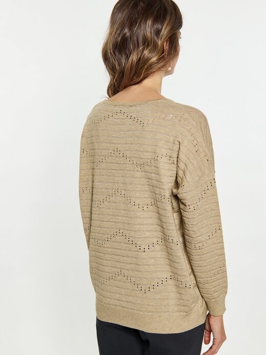 Представляем идеальное дополнение вашего осеннего гардероба – женский свитер с длинными рукавами, нежным V-образным вырезом и свободным, слегка объемным кроем. Нежная структура вязки дополнена горизонтальными рядами украшений. Свитер имеет ребристый низ, манжеты и вырез для структуры и гибкости. Этот вязаный свитер с люверсами и заниженными плечевыми швами создает повседневный и комфортный образ.