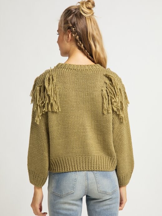 В этом свитере крупной вязки компания usha FESTIVAL представляет нам особенную модель. Оно связано из очень мягкой пряжи и расставляет уникальные акценты с помощью длинной бахромы спереди и сзади. Свободный укороченный крой со слегка заниженной линией плеч хорошо сочетается с джинсами с завышенной талией и узкими брюками.