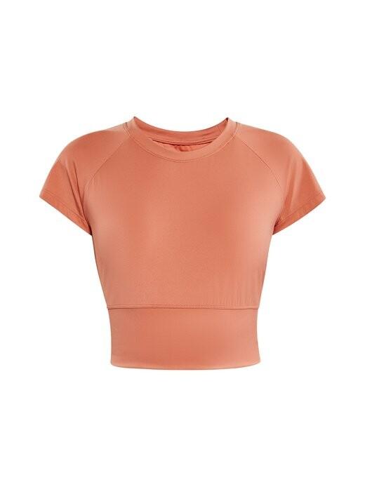 Укороченный топ приталенного силуэта с короткими рукавами и круглым вырезом. Этот топ, изготовленный из гладкой и эластичной ткани, обеспечивает удобную посадку без ущерба для комфорта.
