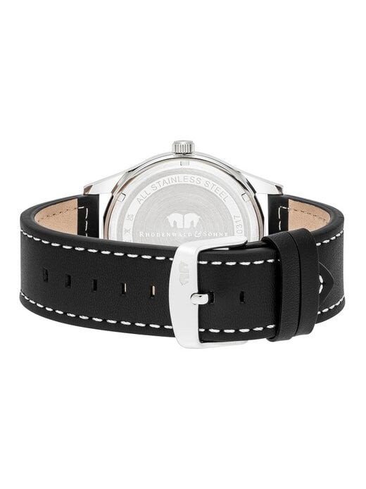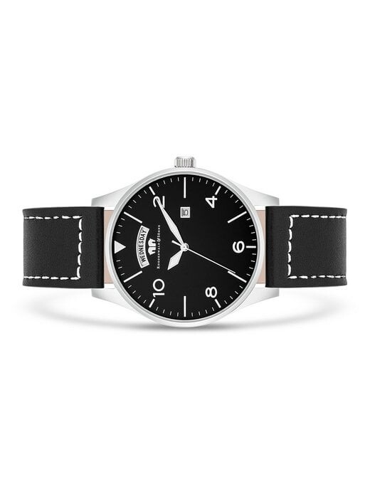 Меньше значит больше: эти эксклюзивные мужские часы мануфактуры Rhodenwald & Söhne были созданы в соответствии с этим девизом. Циферблат, уменьшенный до даты и дня недели, а также простые линейные индексы в сочетании с арабскими цифрами и стрелками Feuille, впечатляют минимализмом.